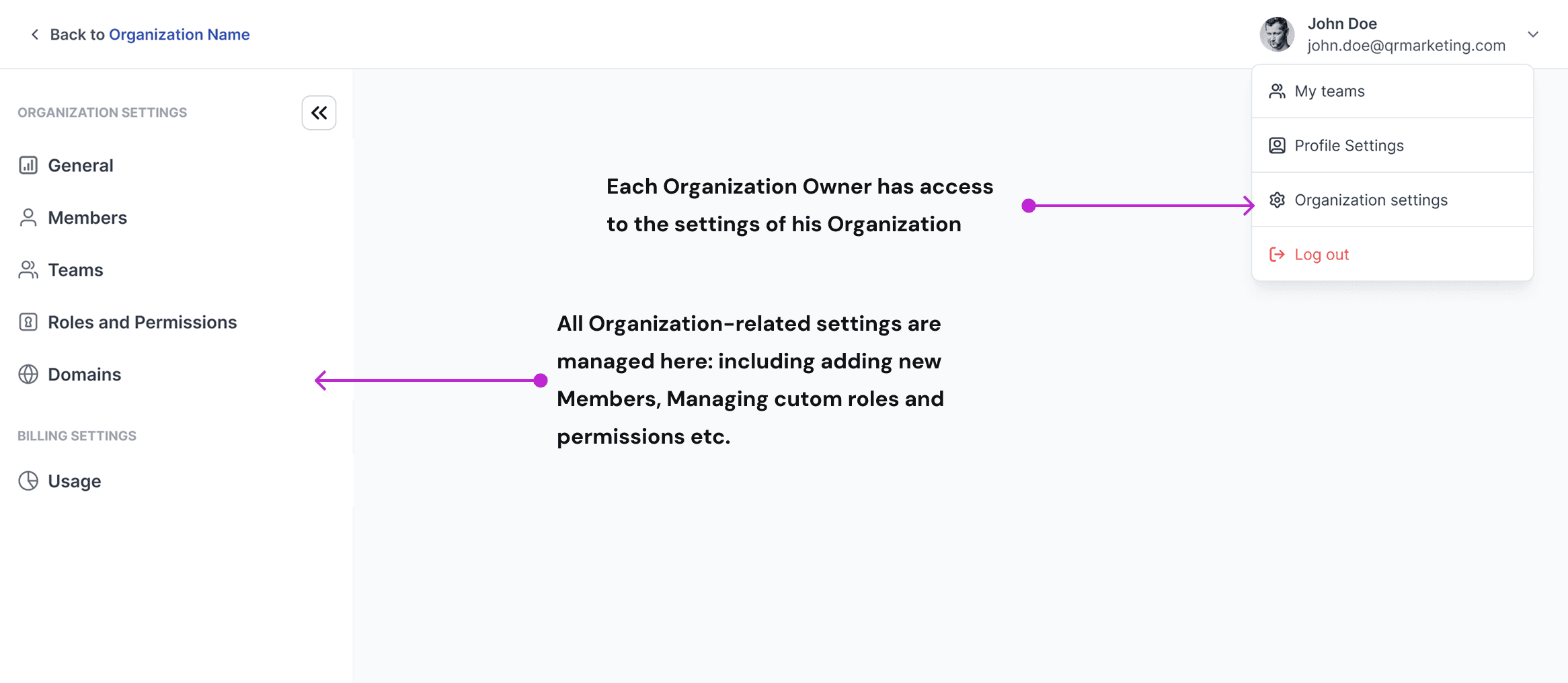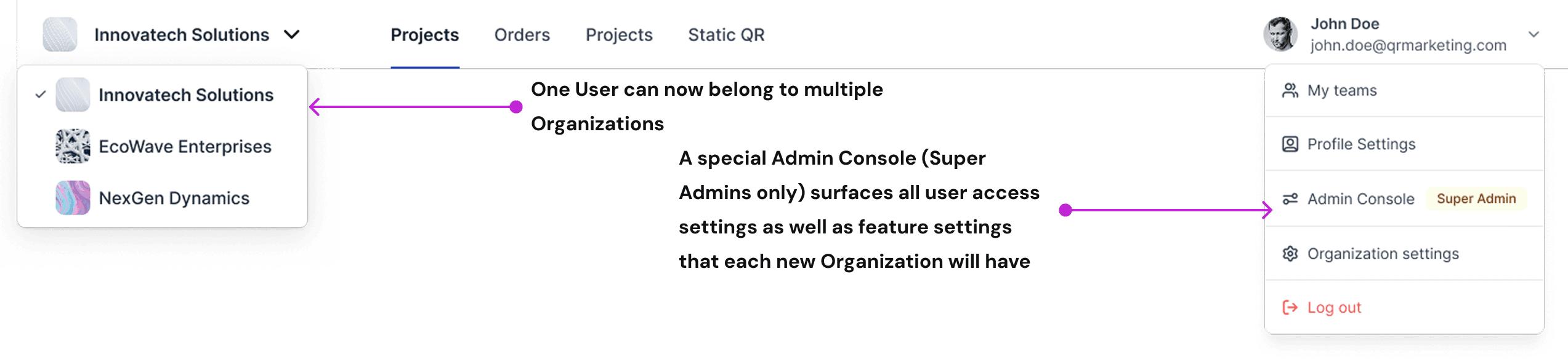 The main navbar now includes an Org switcher (one user can belong to multiple organizations). There is a central place to manage organization Settings- Members, Teams, Domains, Roles & Permissions, and Usage. Also, a separate Admin Console lets Super-Admins view all organizations and create new ones.