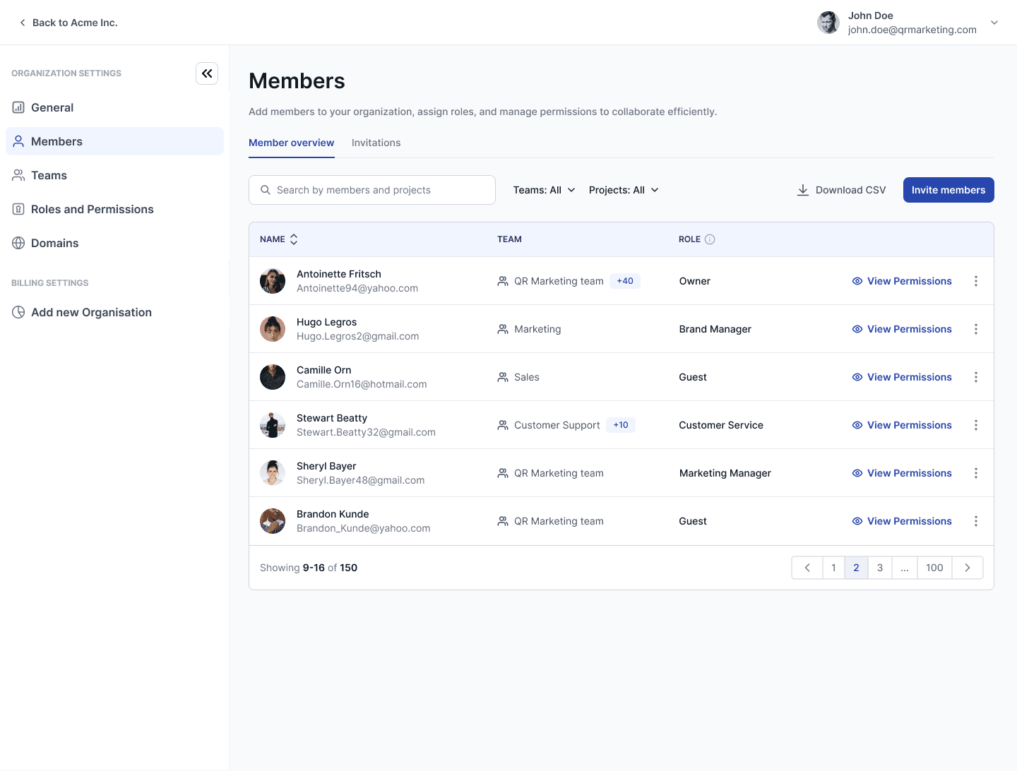 Organization Admin can invite members and grant scoped permissions (Org‑wide, Team‑specific, Project‑specific).