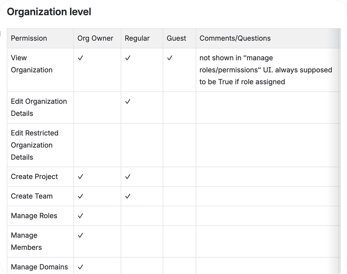In the end, we kept Org-level roles but bundles the permissions together. Access permissions are additive and inherit upwards (Viewer < Editor < Admin), so there’s less to manage. Features act like on/off bundles—turn a feature off and its permissions don’t apply anywhere.