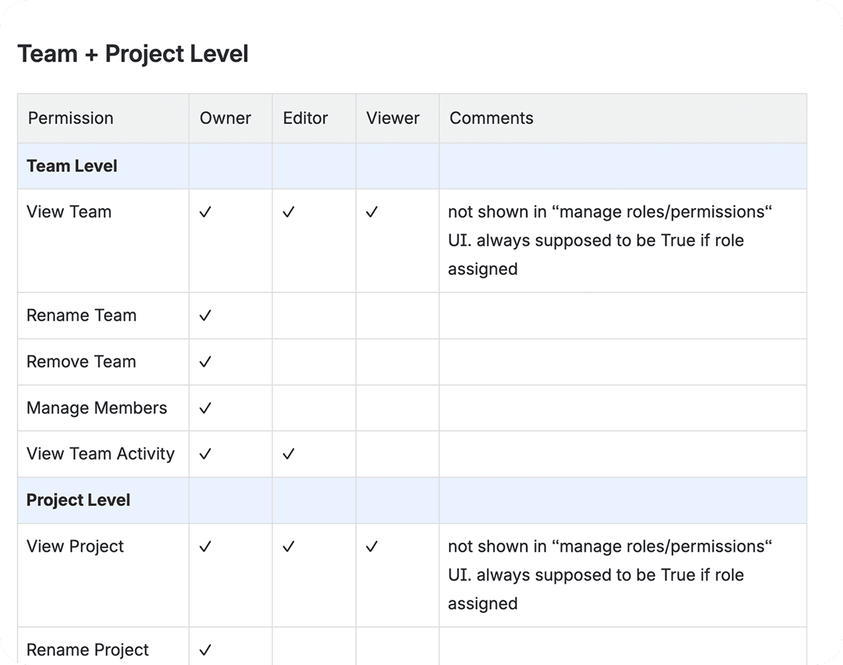 Role labels varied by context. “Owner/Editor/Viewer” could mean different permissions at a Team vs. Project, so users couldn’t predict what they could do.